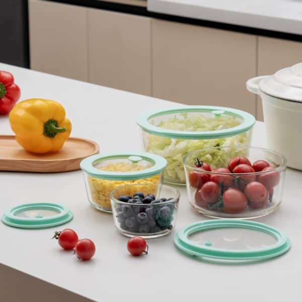 Key Materials– Borosilicate glass body, food-grade silicone lids.